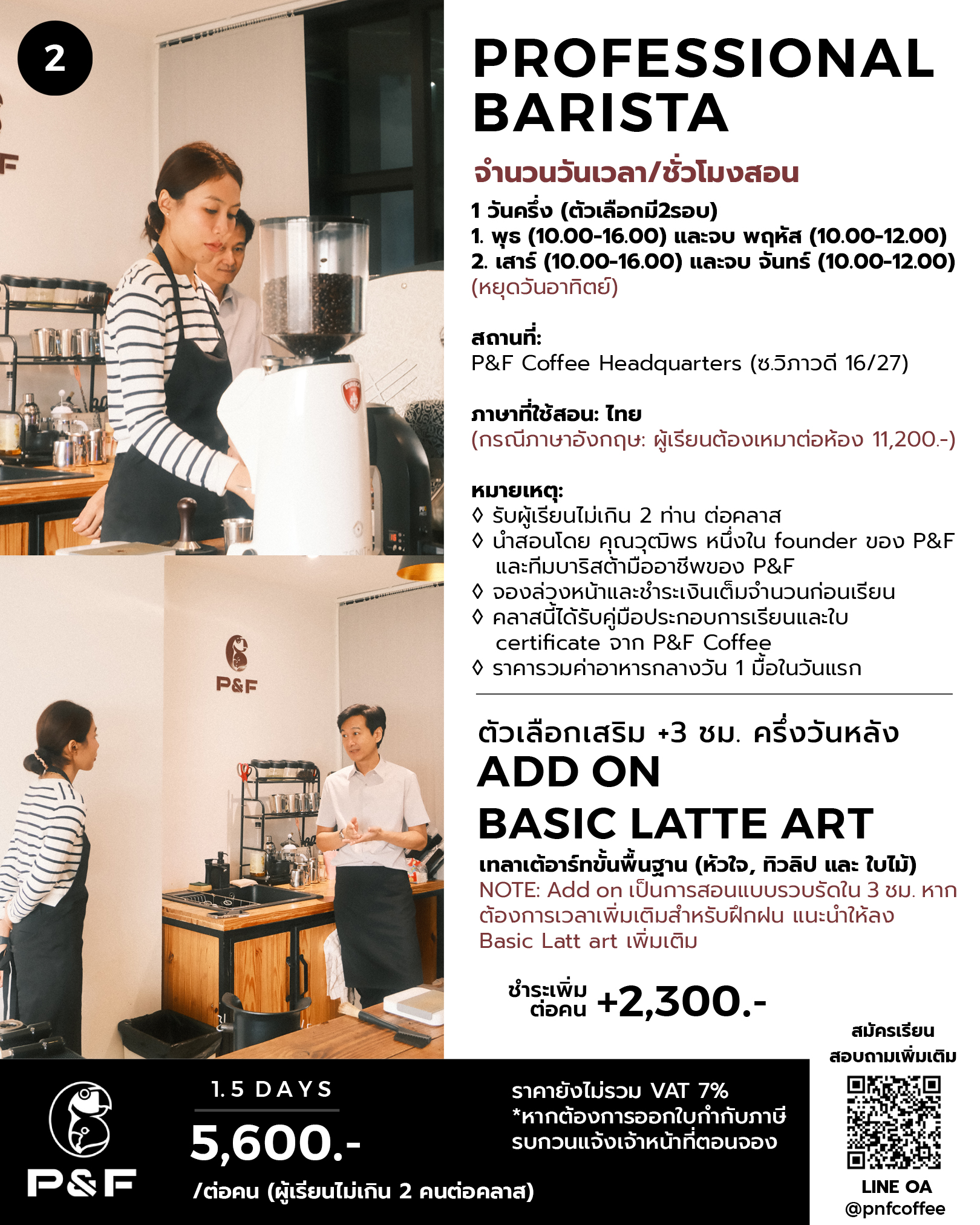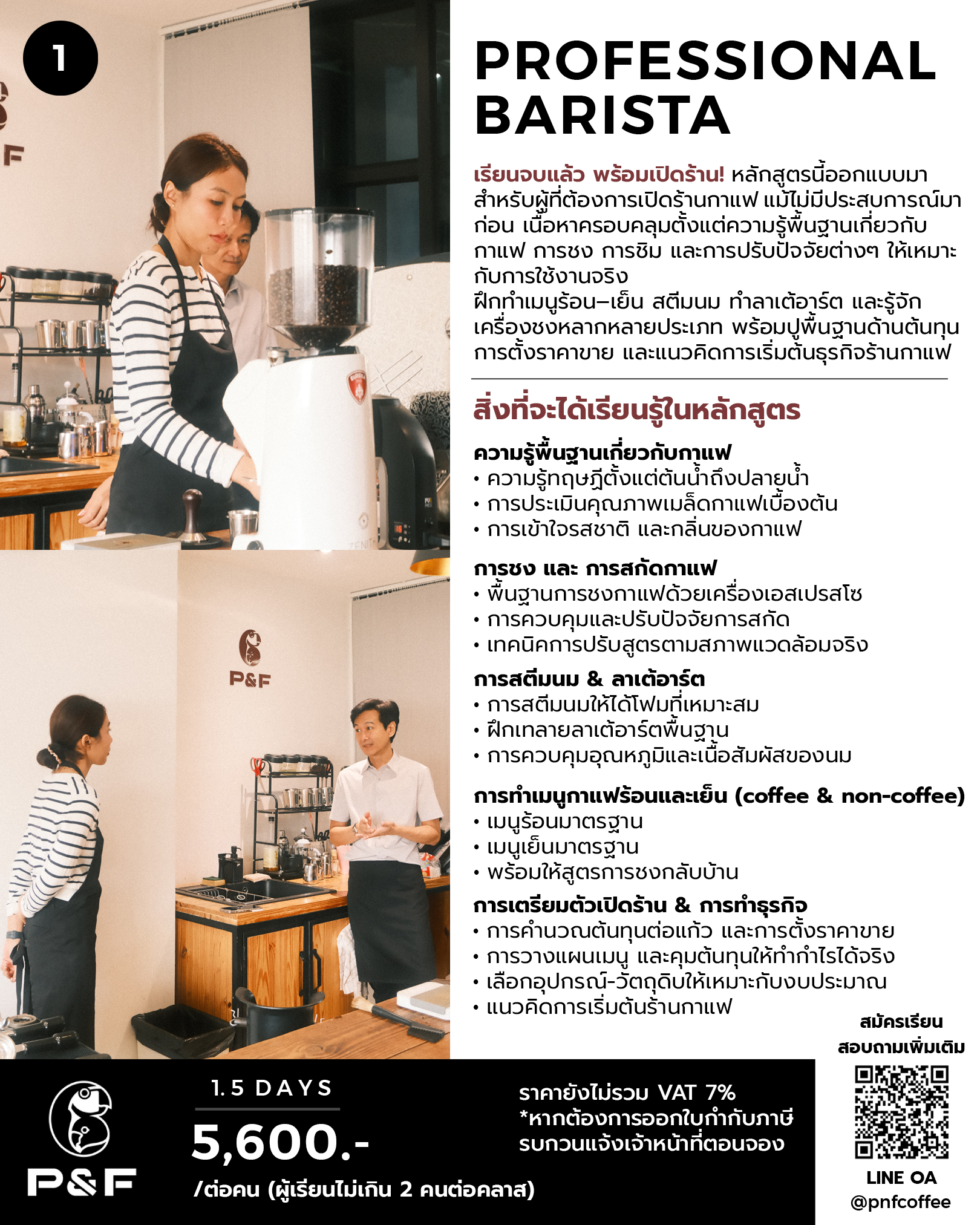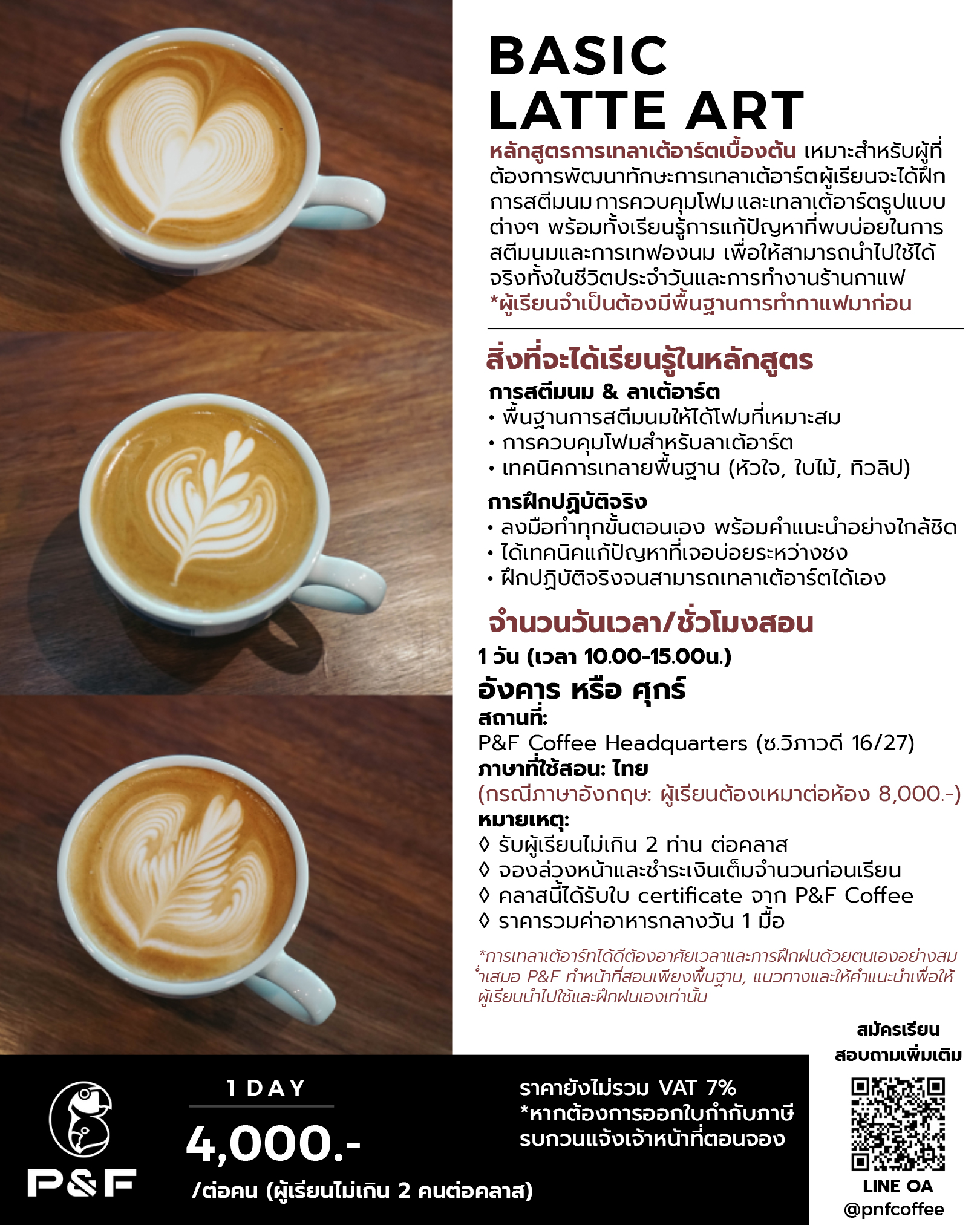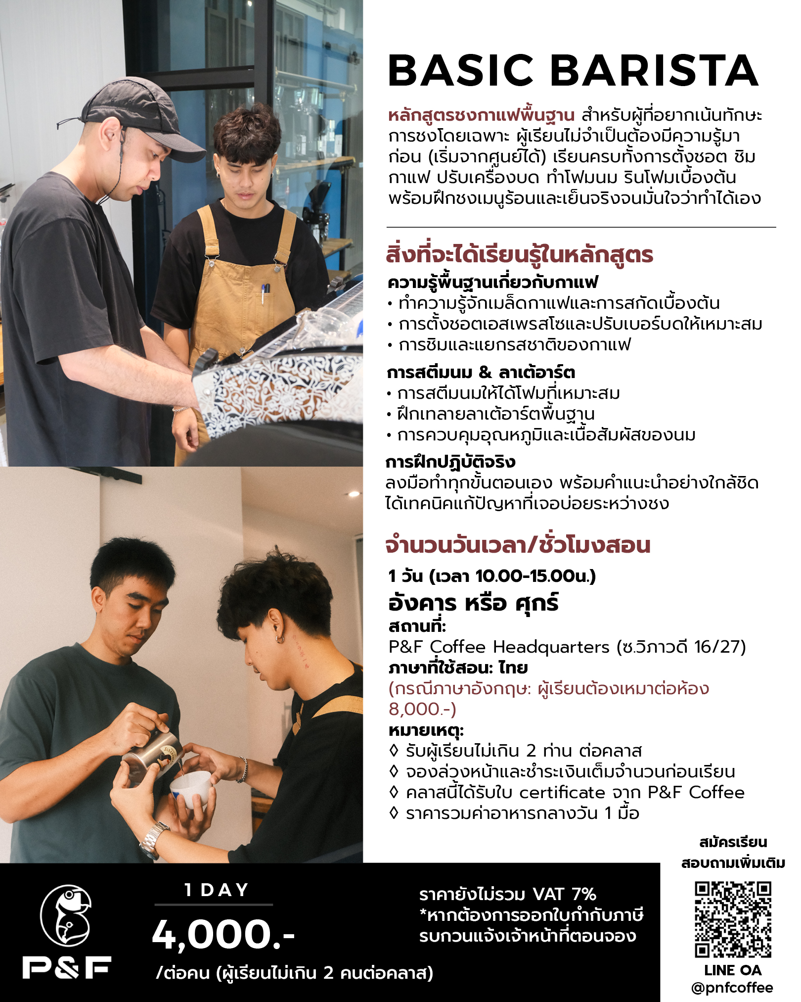 หมายเหตุ: จองล่วงหน้าและชำระเงินเต็มจำนวนก่อนเรียน, คลาสนี้ได้รับใบ certificate จาก P&F Coffee